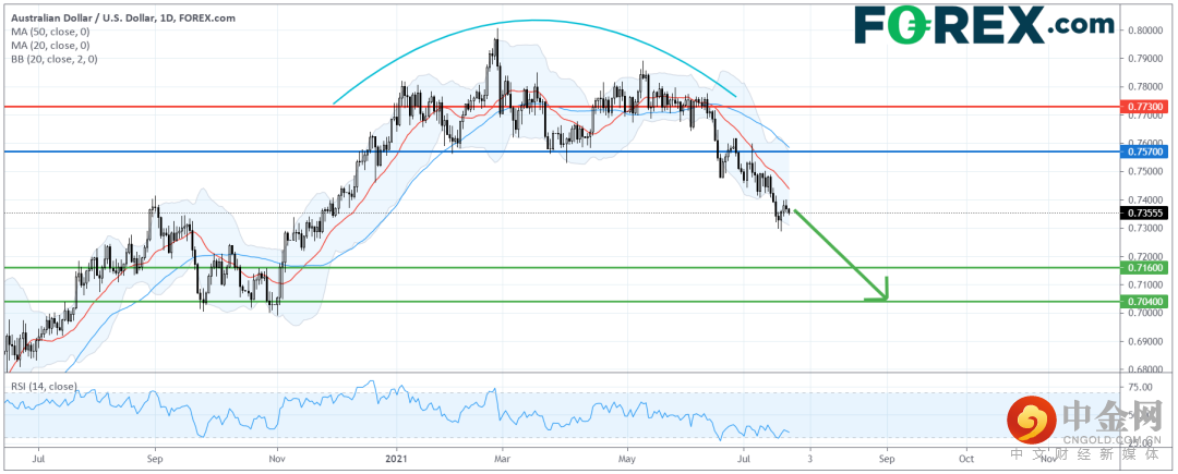 在日线图上,澳元/美元的技术走势持续走弱。此前,它形成了一个圆形顶部后跌破颈线,20日移动均线加速下滑并远离50日移动均线。