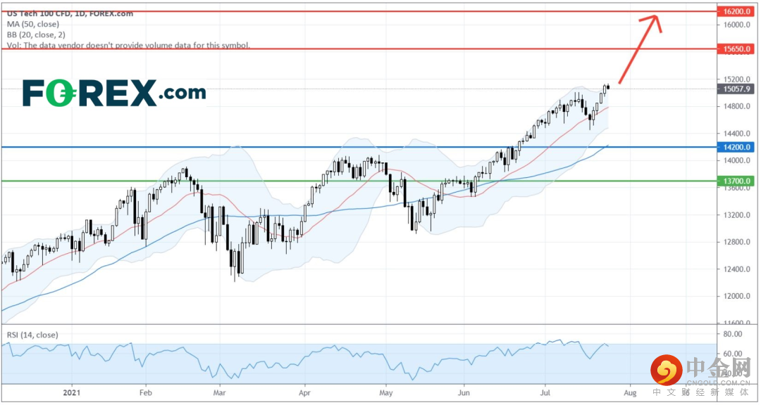 在日线图上,美国科技股100指数CFD 在6月中升破主要阻力 (止损) 位14,000点,确认重新反转看涨,并屡创新高。