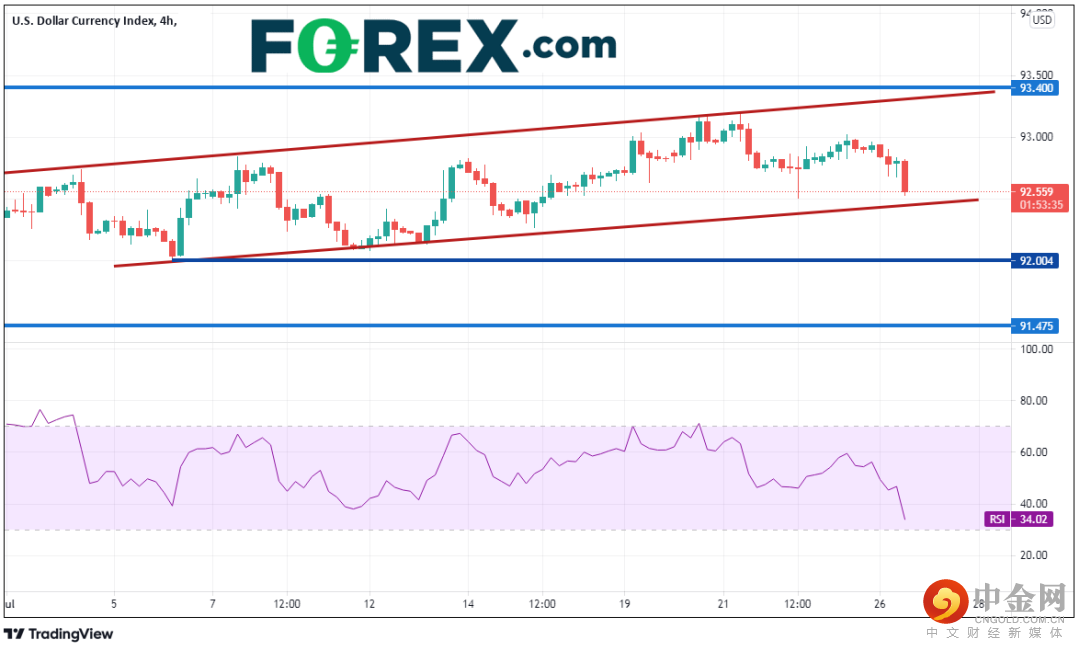 4小时图上的支撑位就在下方不远处,即通道的下轨趋势线92.45附近、7月6日低点92.00附近和6月23日低点91.76。上方阻力位在通道上轨趋势线以及3月31日高点93.30/93.40一线。