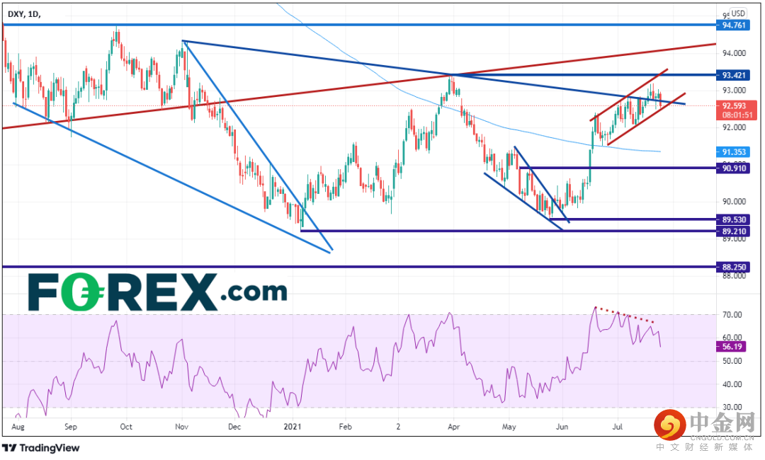 美元指数在5月末打破短线楔形后回到楔形目标(100%回档)并继续走高,形成上升通道。然而,美元指数上周在通道上轨趋势线93.17附近和2020年11月以来长期下降趋势线遇阻,RSI也形成背离。美元指数今天正在回撤并考验通道的下轨趋势线92.50附近。