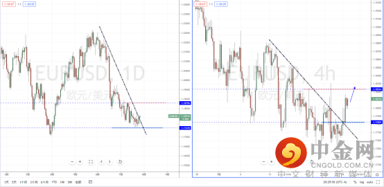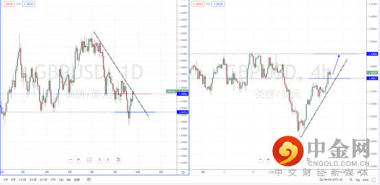 镑美天图:近期趋势在下方筑底后持续向上反弹,下方水平支撑带在1.36724附近。并且短期价格已经有效突破下降趋势线的压制作用,以及水平压制带1.38056一带。从日内4小时级别,价格在短期调整后继续站上压制区域。后市可适当关注价格调整后继续上行的多头机会,上方区间目标位置参考1.39008一带。