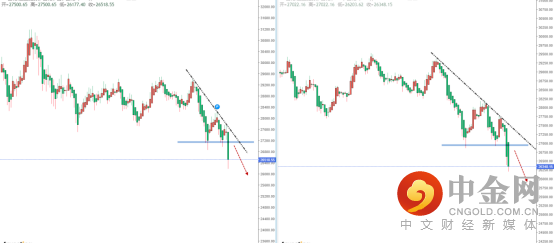 恒生指数天图:目前行情在小幅调整后继续破位下行,上方有下降趋势线的压制作用,其水平压制带在27034.65附近。从日内4小时级别,空头趋势流向确认。可关注价格调整后继续走弱的空头机会,其目标位置参考周线前期低点附近。