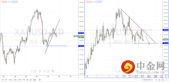 黄金天图:目前整体行情趋势处于偏弱阶段中,在上升趋势线以及水平支撑带1811.185被有效跌破之后,趋势短期动能不足。从日内4小时级别,价格在上方水平压制带1809.468受阻下行,但下方空间幅度有限,不宜追空行情。同时下方也有较强的水平支撑作用,可关注价格调整后再次破位下行的空头机会。