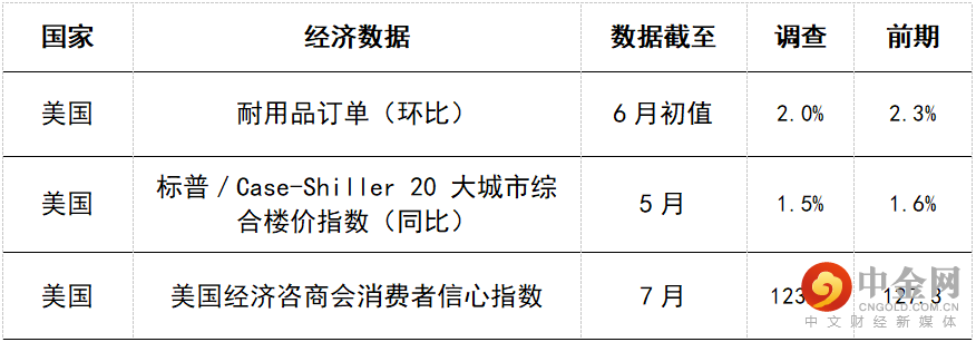 预期美国6月份耐用品订单(不包括运输数据)升0.8%(环比)。6月份耐用品产出(不包括运输)增长温和,一系列制造业调查的新订单指数月内保持高位,与工业活动表现稳健吻合。运输货品方面,考虑到半导体持续短缺,汽车和汽车零件的订单可能减少。然而,民用飞机订单急增,可能抵销汽车业的弱势。整体而言,预期6月份耐用品订单总额增长2.0%(环比)。