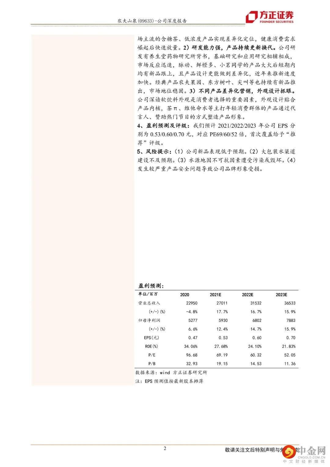 1、占据包装水优质细分赛道,行业仍处于高成长期。2、公司位列包装水第一,水源地、品牌、渠道共同构筑农夫山泉包装水行业护城河。3、软饮料推新高效,产品持续培育,生命周期较长,打开公司业绩天花板。4、盈利预测及评级:我们预计2021/2022/2023年公司EPS分别为0.53/0.60/0.70元,对应PE69/60/52倍,首次覆盖给予“推荐”评级。