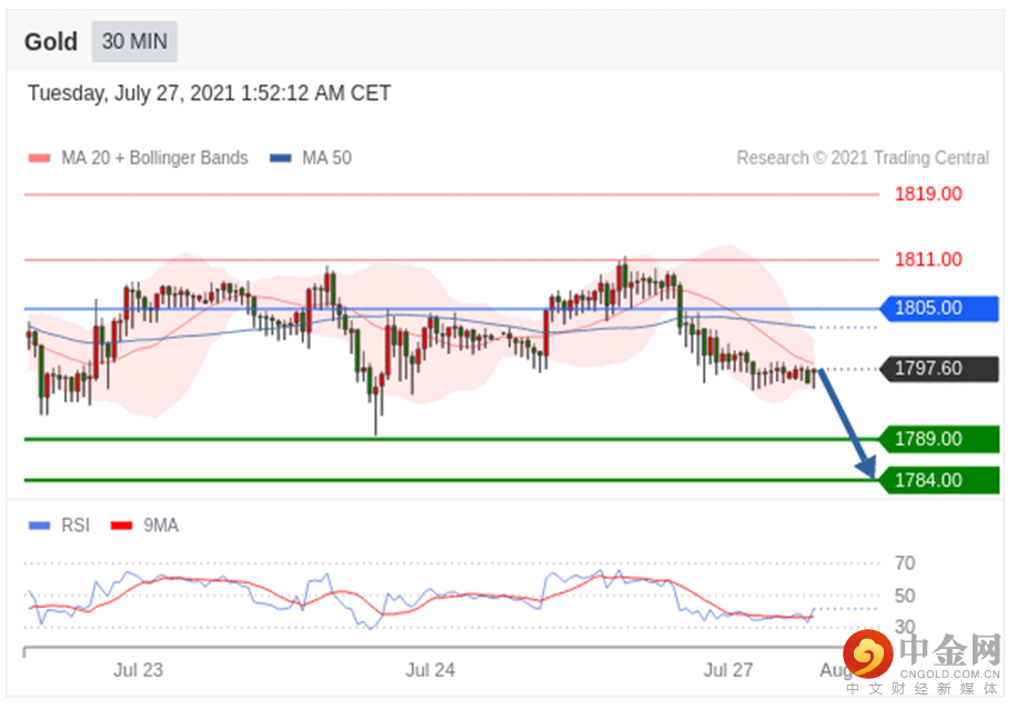 在 1805.00 之下,看跌,目标价位为 1789.00 ,然后为 1784.00 。