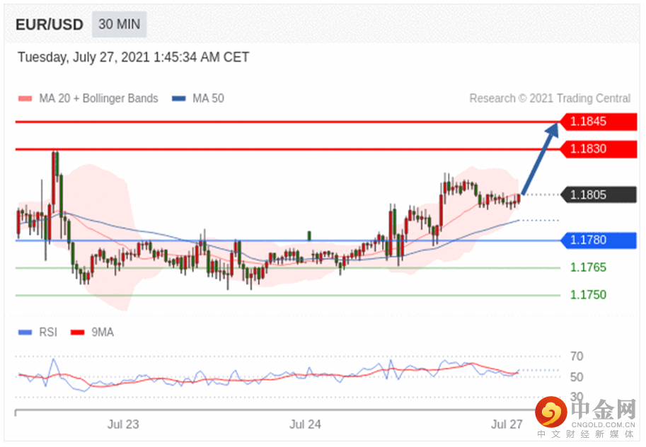 欧元/美元攀升34个点子,报1.1805。在欧洲,德国7月份IFO商业景气指数为100.8 (预期为102.5)。