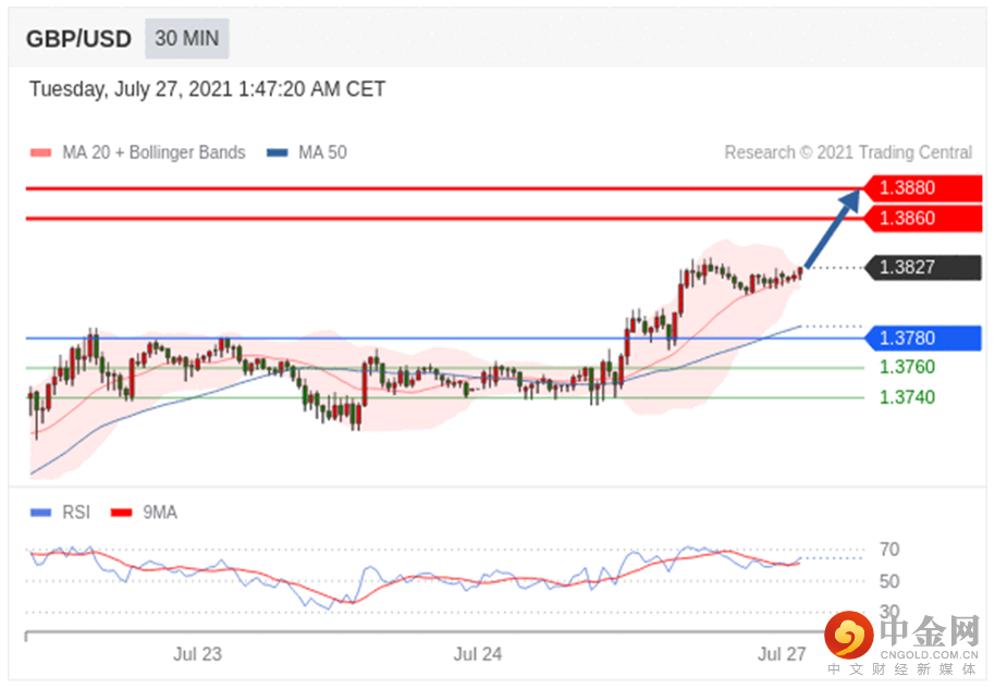 在 1.3780 之上,看涨,目标价位为 1.3860 ,然后为 1.3880 。