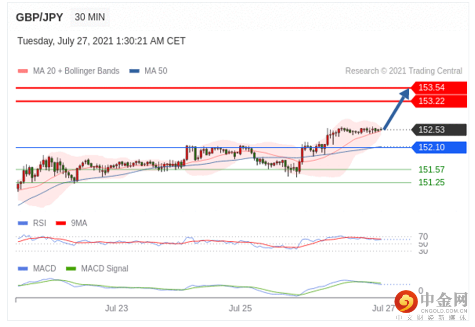看涨,当 152.10 为支撑位,目标定在153.54。