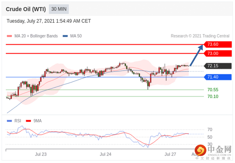 在 71.40 之上,看涨,目标价位为 73.00 ,然后为 73.60 。