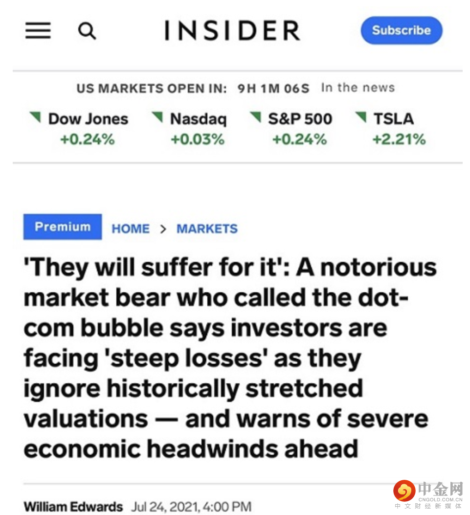 据知名财经网站《商业内幕》(Business Insider)报道,Hussman在7月14日的一篇评论中写道:“我的想法是,经过多年美联储诱导的、追求收益的投机行为之后,投资者再次得出结论——在可能最糟糕的时候——估值根本不重要。我预计他们将为此遭受损失,不仅是在市场周期结束时的巨大损失,还将面临将近20年的漫长、有趣、不知去向的旅程。”