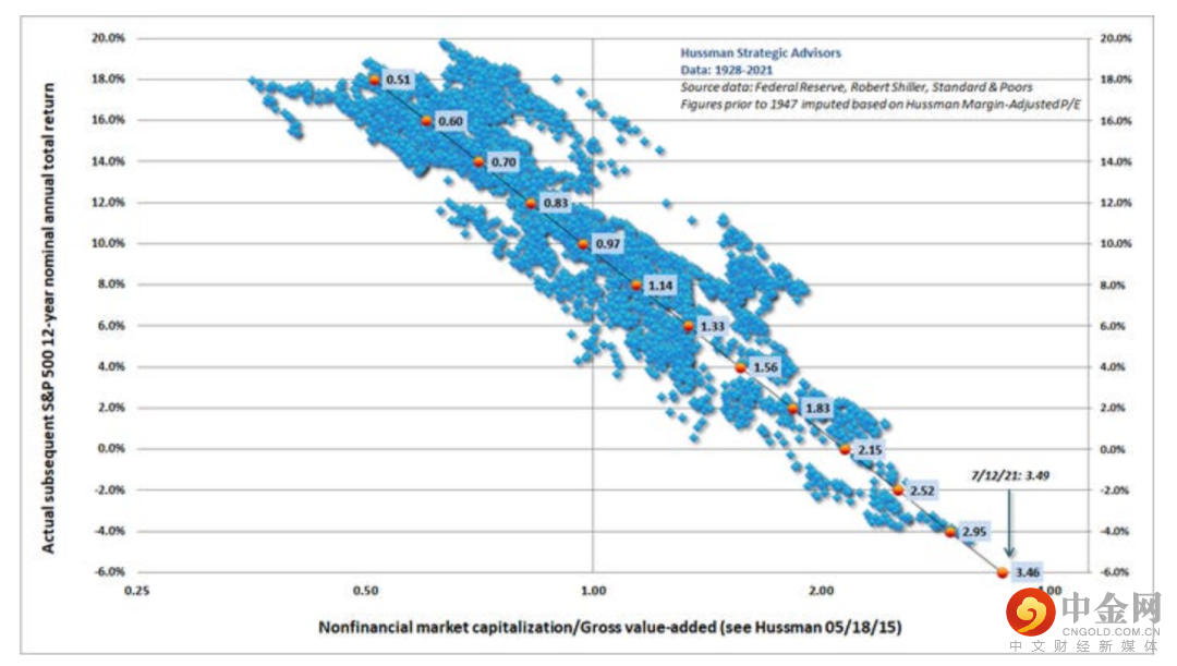 Hussman如此强调估值,是因为它们具有预测能力。下图是标普500指数在不同时间点的回报率。7月12日该指数为3.49,意味着该指数在未来12年的回报率应在-6%左右。