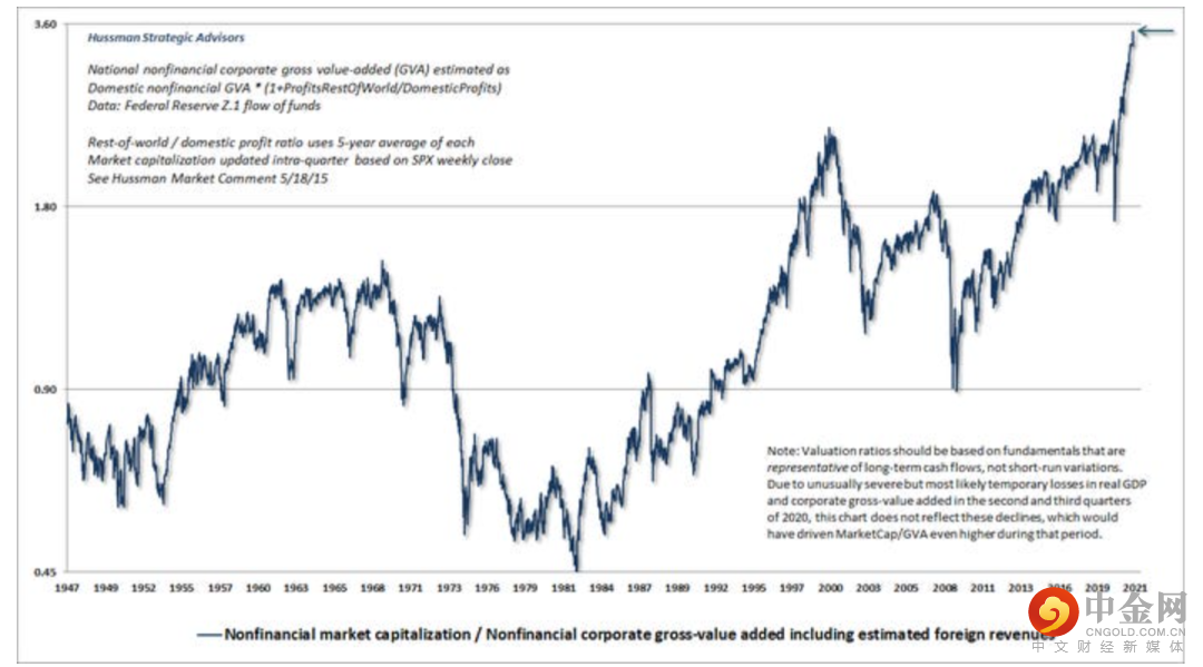 下图是Hussman的主要估值指标——总市值与总附加值或总利润的比率——他表示,“与我们测试或引入的任何其他指标相比,这一指标与实际的后续市场回报之间的关联度仍然更强。”目前的水平高于2000年和2008年泡沫时期的水平。