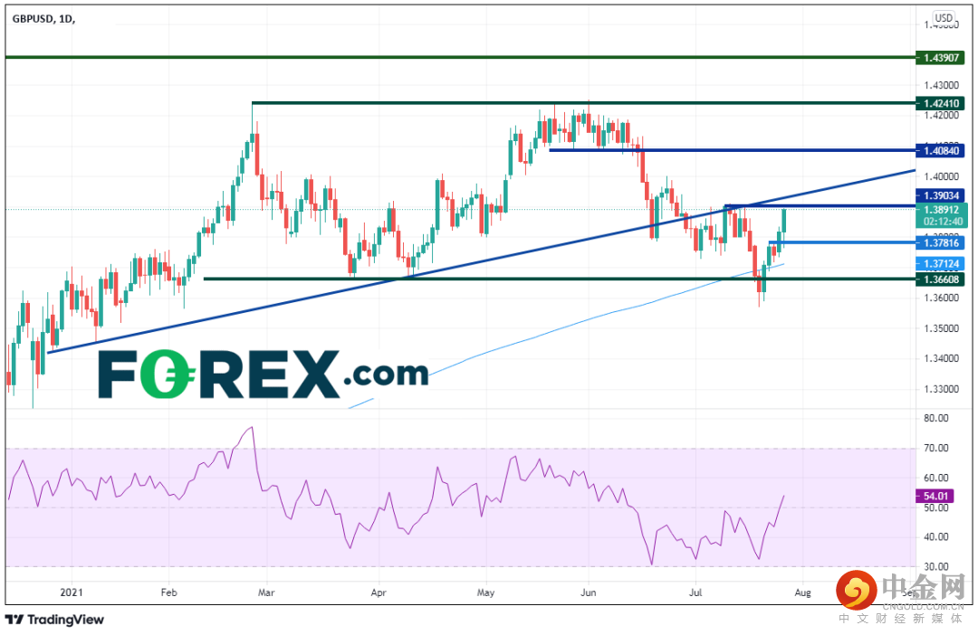 英国全国新增新冠病例数正在减少,英镑正在上涨。上周一“自由日”英国政府取消所有疫情管控措施以来,新增病例就一直在减少。再加上英国需求与支出飚升的预期,IMF将2021年经济增长率预测值从4月份的5.3%上调至7%。这对于英国首相而言是好消息,他指出“我们的经济正呈现以快于预期的速度复苏的良好迹象,但挑战依然严峻”。财政大臣同样评论称,他们“继续重点关注对就业岗位的保护,尽可能多地创造新的就业”。另外,根据《英国金融时报》的报道,英格兰将开始允许完成第二针疫苗接种的美国和欧盟游客入境,此举有望增加就业人数。