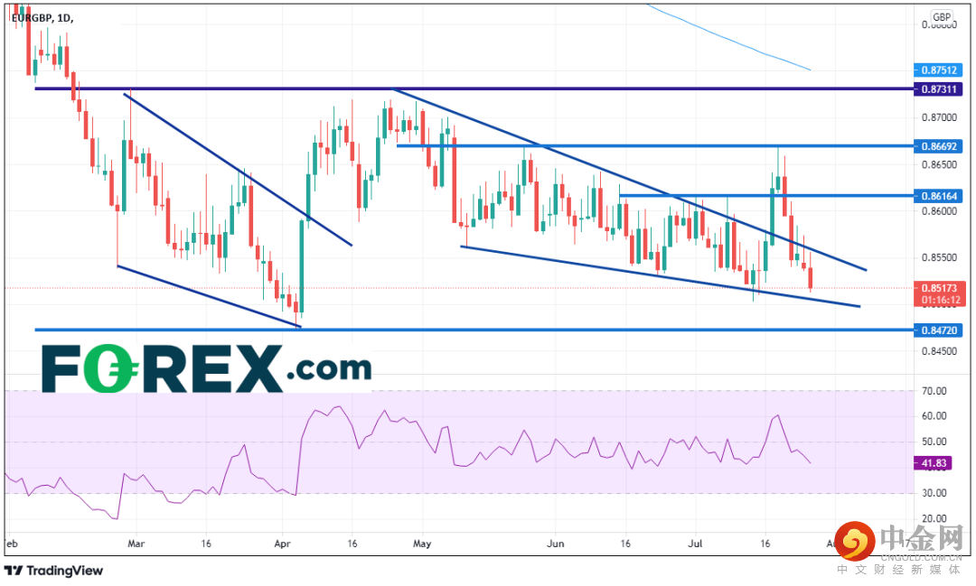 在FOMC将于周三召开会议的背景下,有些人可能将英镑/美元的上涨归因于美元的弱势,因为此时殖利率继续下跌。但英镑不仅兑美元走高,兑欧元同样上扬。欧元/英镑2月中旬以来一直交投于0.8472 - 0.8731区间,并从4月底开始在该区间内形成下降楔形。但在“自由日”当天和第二天,英镑走弱,带动欧元/英镑反弹并突破下降楔形(符合预期)。不过,欧元/英镑的反弹止步于水平阻力位0.8673附近。此后英镑一路上扬,导致欧元/英镑回落至楔形内,目前考验下轨趋势线0.8505附近。下方水平支撑位在区间下轨,上方水平阻力位在楔形上轨下降趋势线所在的0.8560附近。上档其它阻力位在0.8616附近和7月20日高点0.9670。