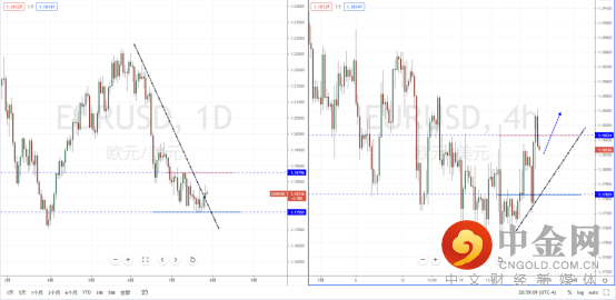 欧美天图:目前行情在下方支撑带1.17555附近止跌后起稳,但价格虽有向上冲击下降趋势线,但由于美元指数处于在纠结状态,使得欧美动能缺乏上冲动力。从日内4小时级别,价格在有效突破水平压制带1.18234后继续回落承压。短期趋势需要进一步关注调整后起稳机会,目标位置可参考1.18415一带。
