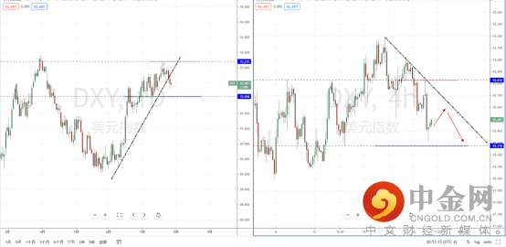 美元指数天图:短期趋势继续在头部状态中,上方水平压制带在93.215一带。虽然目前上升趋势线有被跌破,但需要关注价格调整后继续下行确认空头流向。从日内4小时级别,其趋势在下行之后测试短期支撑92.278一带。可适当关注价格调整后继续走弱的空头机会,目标位置参考前期低点附近。