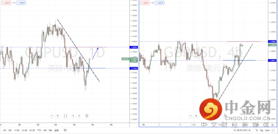 镑美天图:短期价格在下方底部区间反弹之后继续上行,并且已经有效突破下降趋势线的压制作用,以及水平压制带1.37920附近。整体多头格局已经确认,从日内4小时级别,价格也临近上方短期压制带1.39008一带。近期可关注价格调整后继续上行突破的多头机会,其目标位置参考1.39954一带。