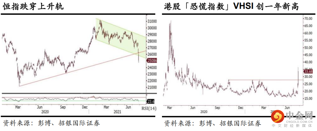 恒指失守上升轨,恐慌指数创逾一新高。图表上,恒指已跌穿多个主要支持位,包括下降通道底部和20年3月以来的上升轨。恒指波幅指数VHSI飙升至33.7,逾一年新高,反映恐慌情绪急升,已出现恐慌性抛售,短期反而有机会技术性反弹,唯投资者信心已转弱,在监管风险阴霾下,估计短期内反弹幅度有限。