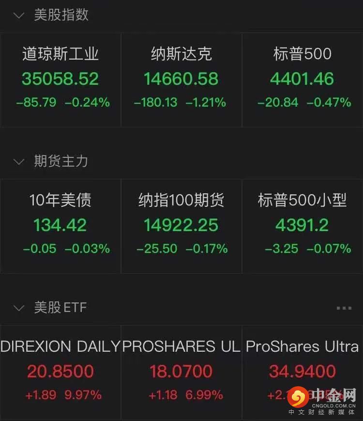 科技股总体表现不佳。龙头科技股中,特斯拉收跌近2%。其他明星科技股中,亚马逊收跌近2%,苹果、谷歌母公司Alphabet、脸书均跌超1%,微软跌近0.9%。新能源车股也集体下跌。法拉第未来跌超17%。小鹏汽车跌近15%,理想汽车跌近14%,蔚来汽车跌超8%。