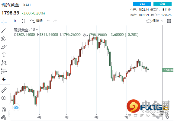 COMEX 8月黄金期货收盘微涨,报1799.80美元/盎司。