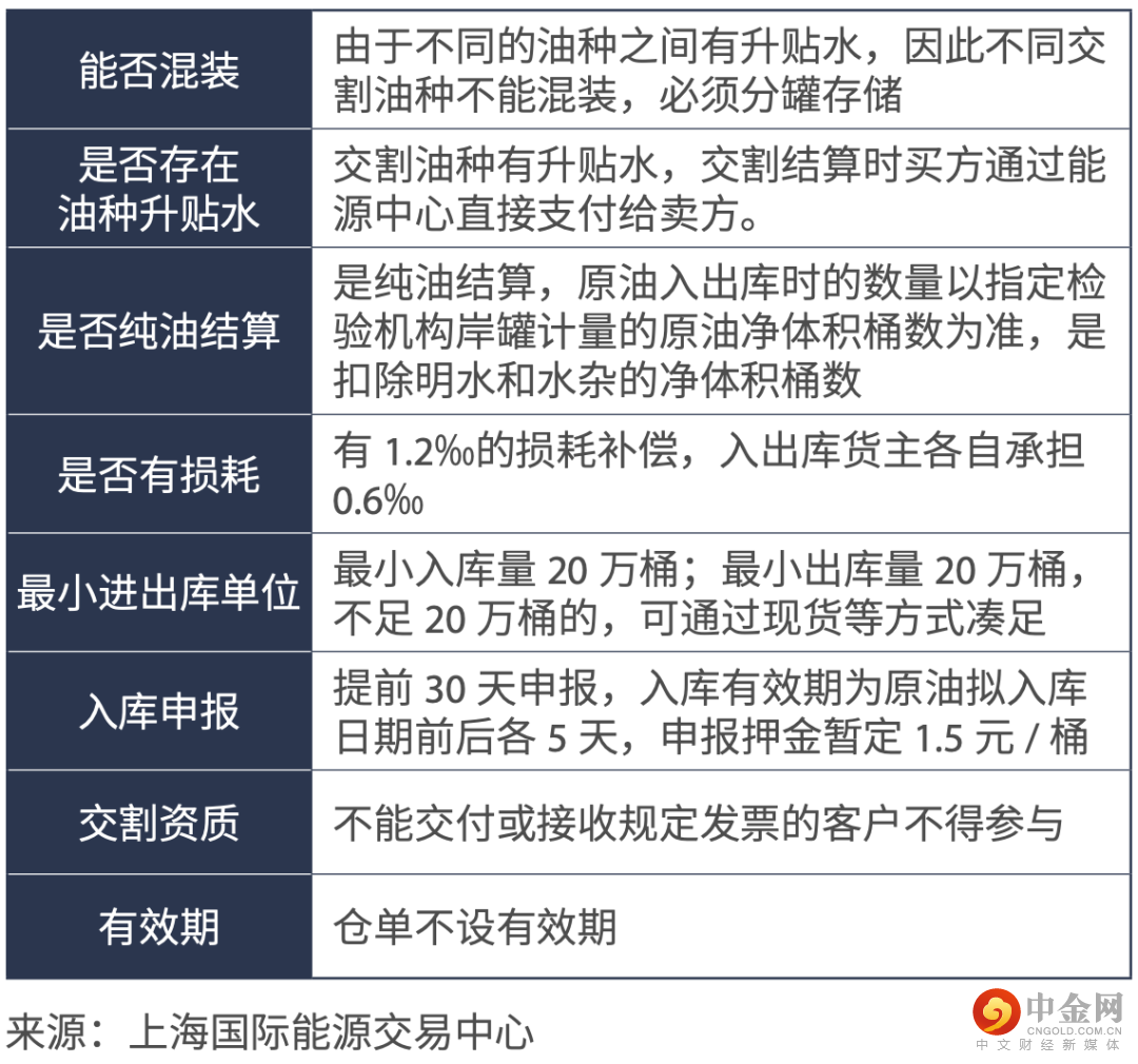 原油实物交割要求对方提供原油原产地证明、原油装船港提单,海关报关单证、原油的装卸货记录等,并且上述单证中的有关内容必须相互匹配,不得有矛盾或者不一致之处,不允许 在中途装、卸船等。入库生成标准仓单前,以指定检验机构按照原油期货检验细则所载明的检验指标和方法检验,检验合格,单证审定合格才能生成标准仓单。