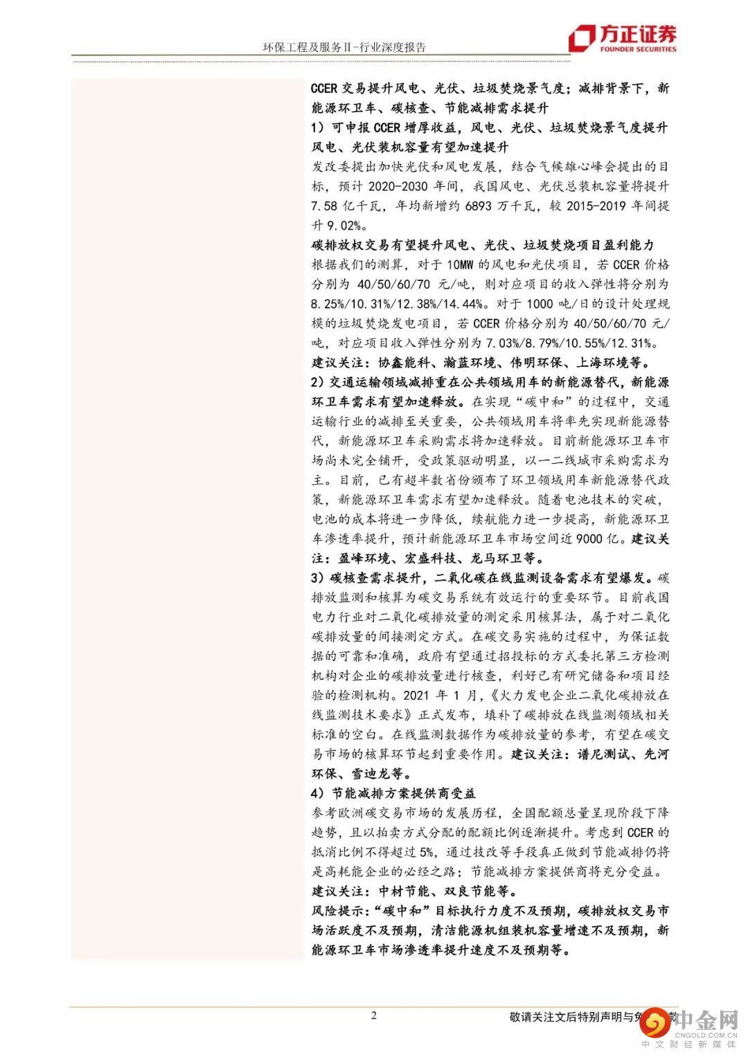 CCER交易提升风电、光伏、垃圾焚烧景气度;减排背景下,新能源环卫车、碳核查、节能减排需求提升1)可申报CCER增厚收益,风电、光伏、垃圾焚烧景气度提升风电、光伏装机容量有望加速提升碳排放权交易有望提升风电、光伏、垃圾焚烧项目盈利能力对于10MW的风电和光伏项目,若CCER价格分别为40/50/60/70元/吨,则对应项目的收入弹性将分别为8.25%/10.31%/12.38%/14.44%。对于1000吨/日的设计处理规模的垃圾焚烧发电项目,若CCER价格分别为40/50/60/70元/吨,对应项目收入弹性分别为7.03%/8.79%/10.55%/12.31%。建议关注:协鑫能科、瀚蓝环境、伟明环保、上海环境等。2)交通运输领域减排重在公共领域用车的新能源替代,新能源环卫车需求有望加速释放。建议关注:盈峰环境、宏盛科技、龙马环卫等。3)碳核查需求提升,二氧化碳在线监测设备需求有望爆发。建议关注:谱尼测试、先河环保、雪迪龙等。4)节能减排方案提供商受益