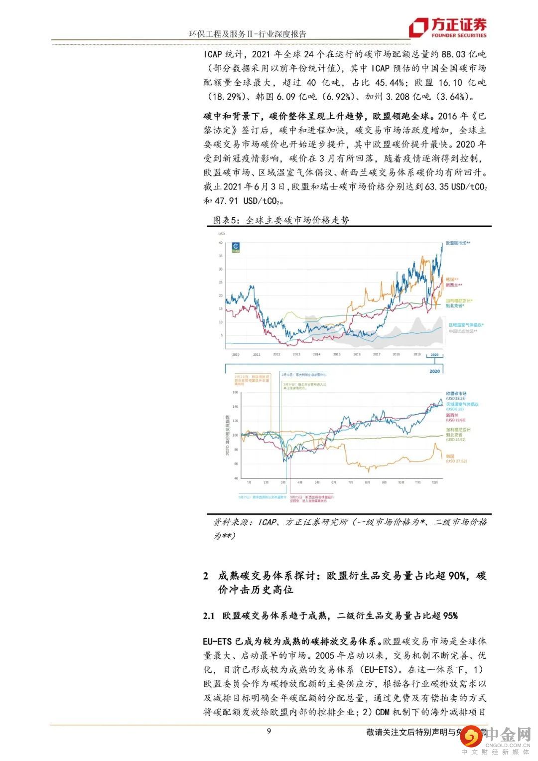 全球倡导碳减排,碳市场不断完善,碳价呈上升趋势巴黎协定签订后,碳交易活跃度提高,全球主要碳市场交易价格开始逐步提升,其中欧盟碳价提升最快,已突破60 USD/tCO2,为全球最高。