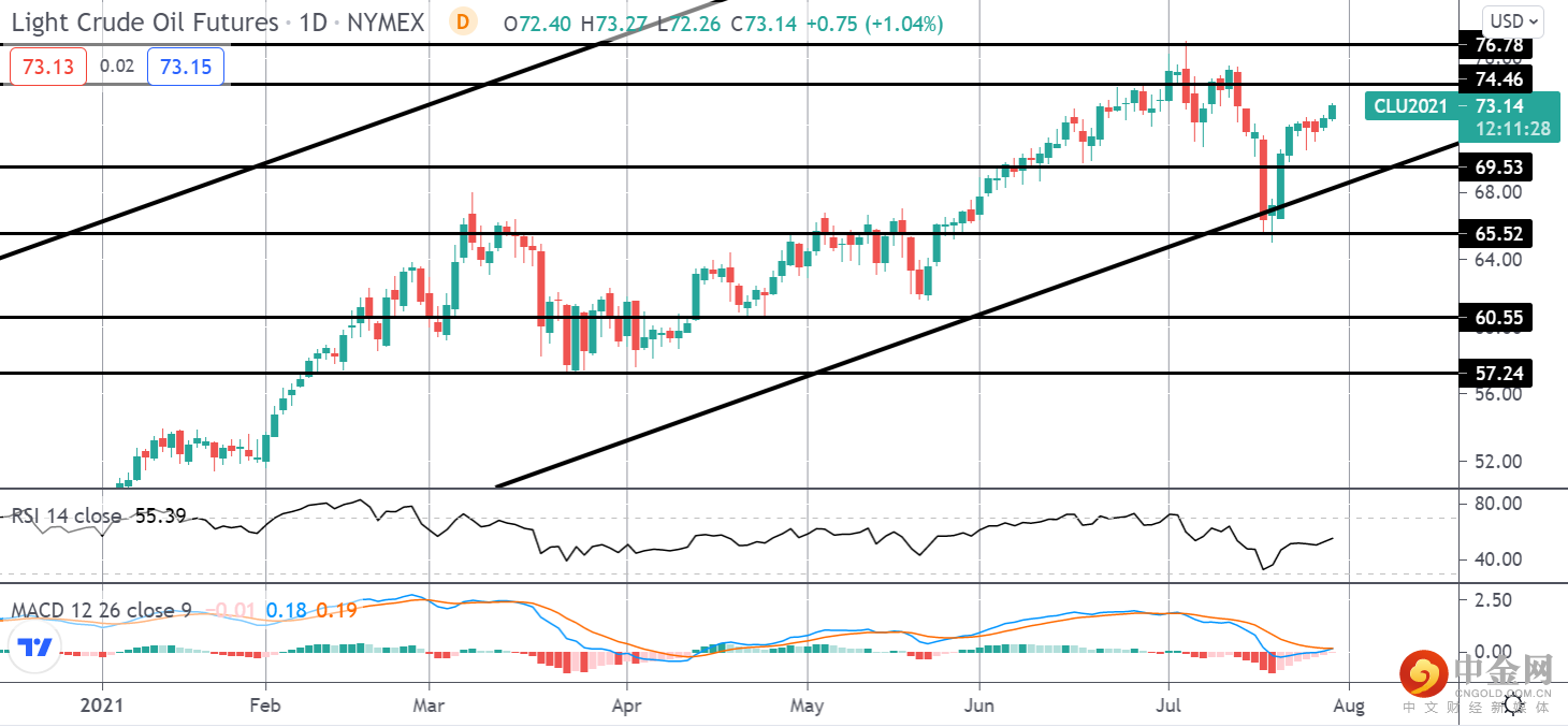 油价下跌超过 16% 的回调似乎并没有阻止长期参与者。此后油价上涨并超过上周的高点,截至撰写本文时,交易价格回升至 73.14 美元。此举背后的主要驱动力是风险偏好的广泛回升。最近投资者对重新出现的 COVID 担忧的不确定性被证明是短暂的,风险资产此后强劲反弹。