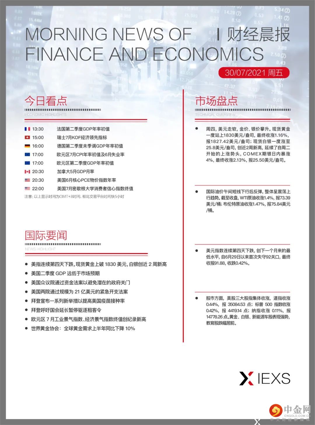 【美国二季度GDP环比增长6.5% 低于预期】分析师表示,美国第二季经济增长几乎没有加速,逊于预期,因政府支出、住宅投资和库存拖累经济增长。然而,由疫苗推动的消费支出激增,推动总产出创下新高。由于疫苗接种、联邦财政救济和更广泛的经济重新开放,美国人既有必要的资金,也有机会增加在外出就餐等服务上的支出。额外的现金加上强劲的招聘也帮助维持了商品支出。