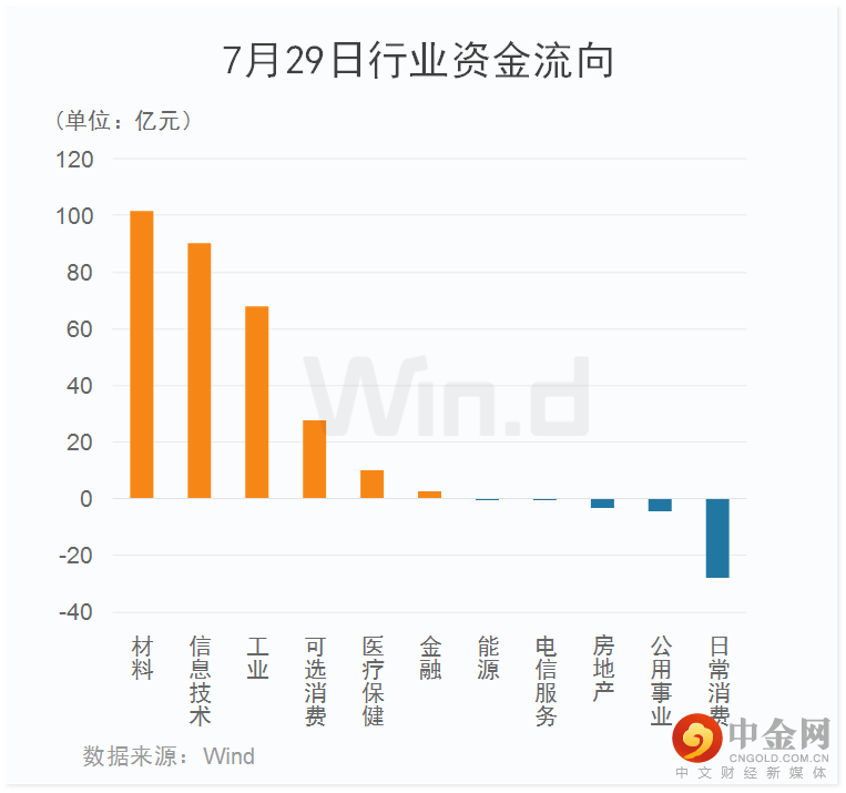 7月29日行业资金流向来看,主力资金净流入260多亿元,其中材料板块净流入超过100亿元,位居首位;信息技术、工业板块紧随其后,净流入额亦超60亿元。日常消费板块则流出额相对较多,净流出20多亿。