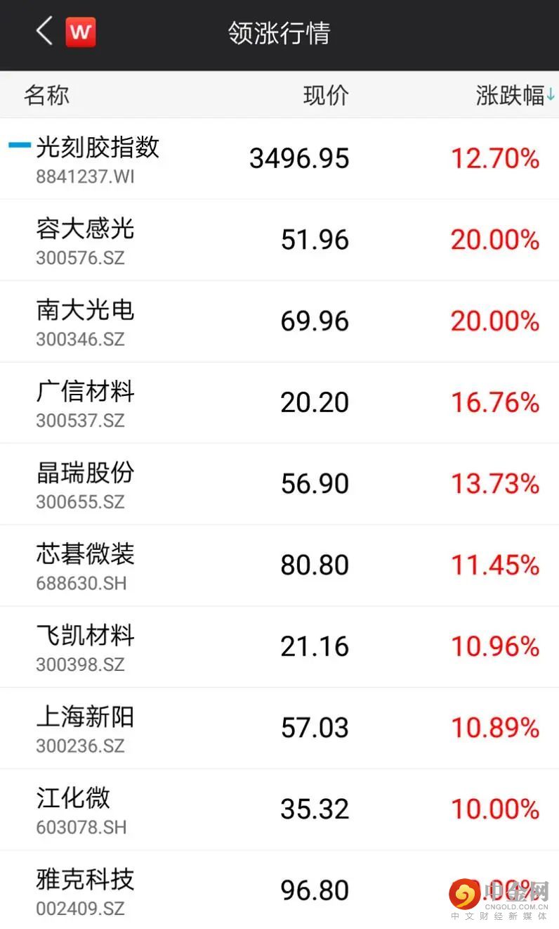 从涨幅居首的光刻胶板块来看,容大感光、南大光电均20CM涨停,广信材料、晶瑞股份、芯基微装、飞凯材料、上海新阳、江化微、雅克科技等公司涨幅均在10%以上。