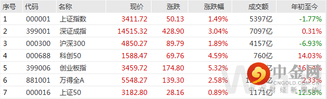 截至7月29日收盘,上证指数涨1.49%报收于3411.72点;深成指涨3.04%报收于14515.32点;创业板指涨5.32%报收于3459.72点,万得全A总成交1.24万亿。