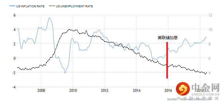 2015年12月,美国自08年金融危机爆发后首次加息。当时通胀数据并未达到2%,仅仅是在0%上下震荡,但是失业率数据显示就业情况良好。因此尽管市场因为通胀数据怀疑美联储不会加息,但最终美联储还是按照自己的步伐实施了加息政策。