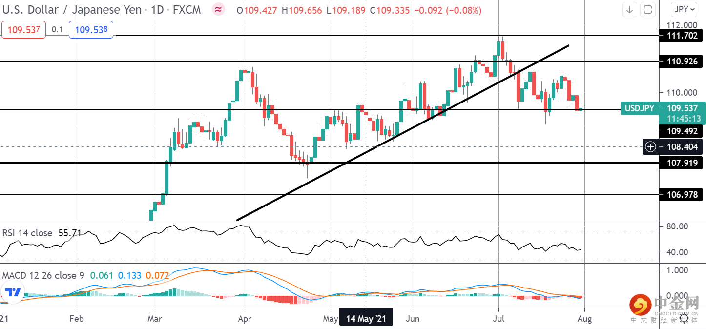 美元兑日元处于 109.42 水平的支撑位。 从近期高点的回调相当费力,表明有继续走低的空间。 然而,如果今天的数据令人失望,则有下跌的空间来清除任何建立的止损。 如果价格跌破 109.2 水平,空头可以寻找下一个 107.91 水平的测试。