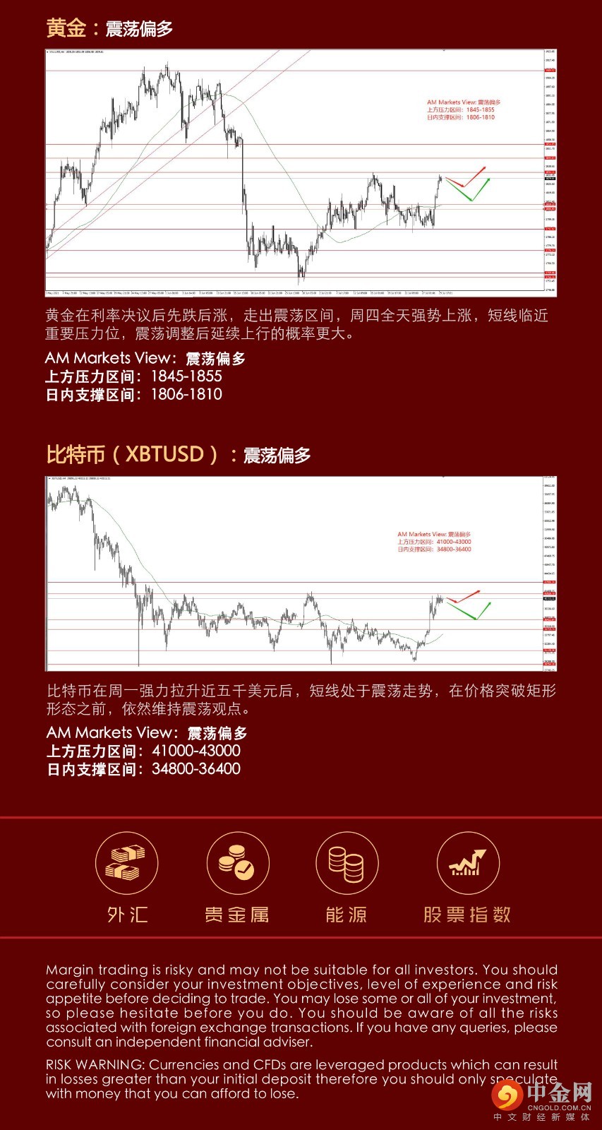 周四美元延续调整,美元指数四连阴,下行走势初现端倪。市场对美联储加息预期有所缓解,同时美国缩减购债的步伐不及预期,近几日非美货币震荡上行较高。黄金两个交易日上涨近40美元,维持看涨。原油窄幅震荡,日线收涨。比特币维持在4W美元附近盘整。