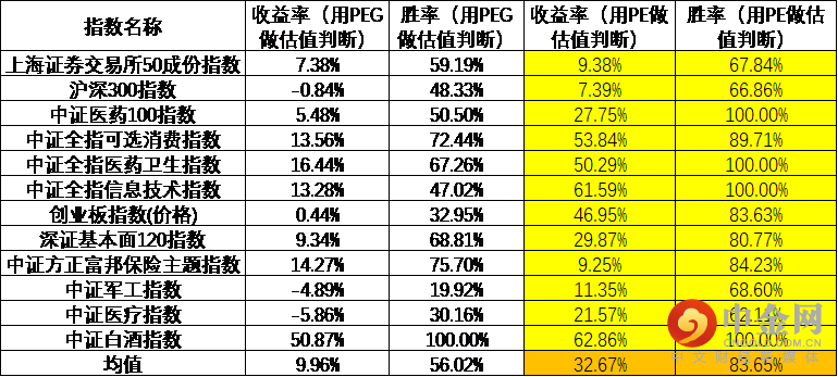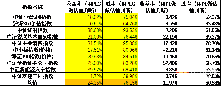 我们现在来做一个测试,取样开始时间2013年1月1日,设置2013年7月1日为统计开始时间,从该时间开始,根据上述规则,对各宽基指数、行业主题指数的PE、PEG进行统计(中证全指金融地产指数、沪深300地产等权重指数、中证银行指数的估值用PB进行刻画),每日产生低估、正常、高估信号(信号由当日估值与回溯到取样开始时间的所有估值进行比较得出)。如果产生低估信号,则买入并持有一年,统计其持有一年收益和持有一年胜率,并分别计算其平均值。