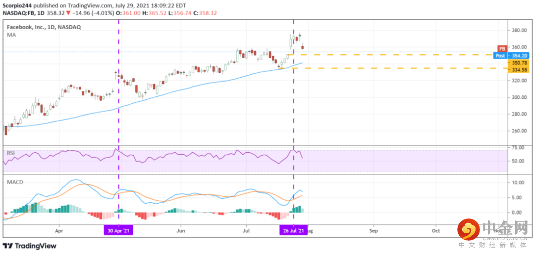 目前Facebook的股票在355美元处有一个需要被填补的缺口,这里会提供一些支撑。