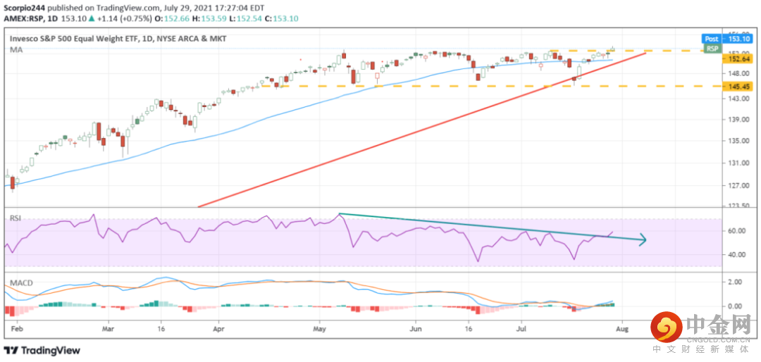 与此同时,标普500平均加权指数基金尝试向上突破。从技术上分析,标普500平均加权指数基金创下新的收盘历史记录,不过点数太过接近。我们需要对这一突破的确认。