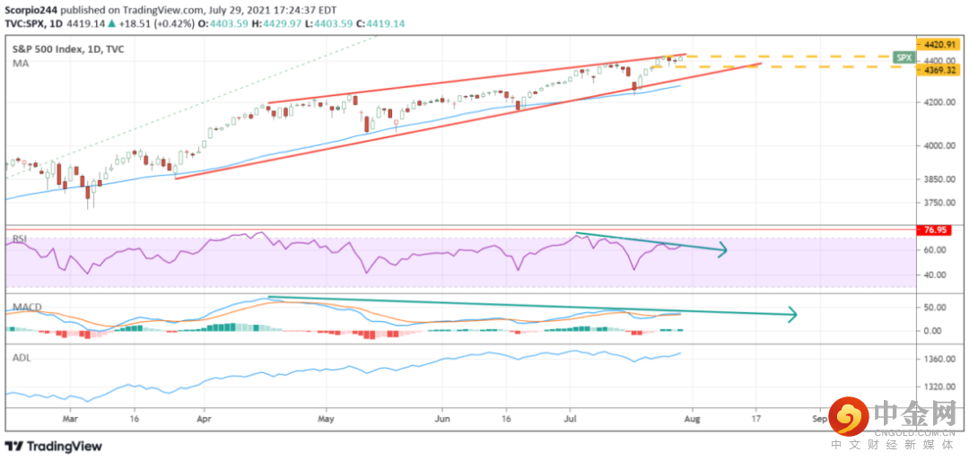 动能趋势仍在背离,腾落指数、相对强弱指数RSI以及MACD均呈下降趋势。就目前而言,我认为最低限度测试了50日移动均线。