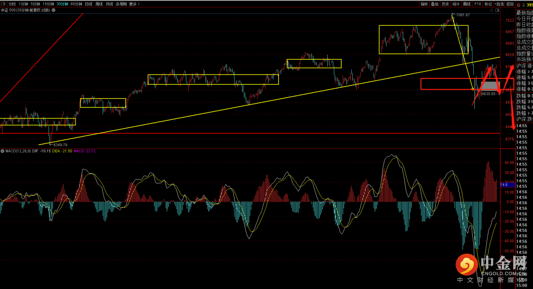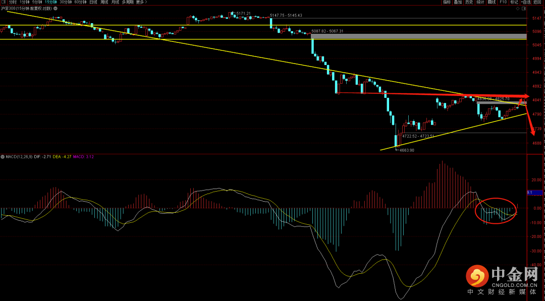 沪深300目前面临着十五分钟的三角收敛末端,如果出现冲高则在回抽到前高附近后才会再回落,而如果直接跌破则大概率会再次试探前期低点支撑。
