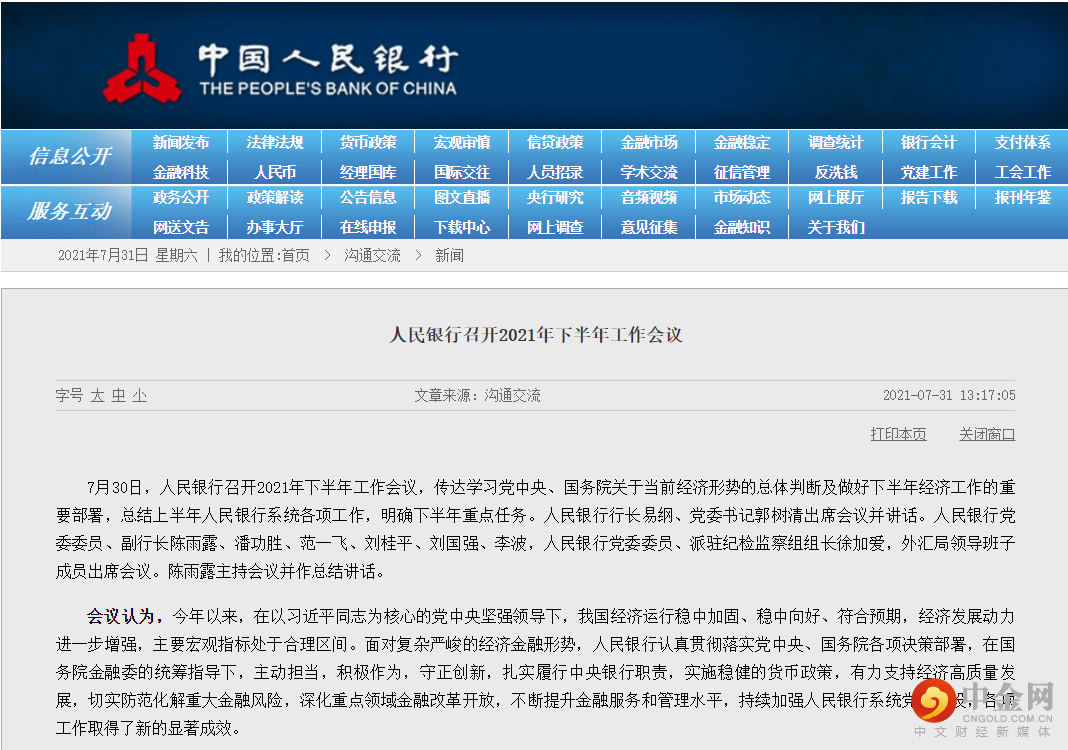 7月31日,据中国人民银行官网消息,近日,人民银行召开2021年下半年工作会议,会议总结上半年人民银行系统各项工作,明确下半年重点任务。