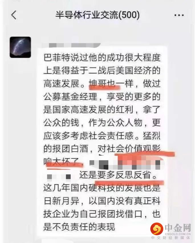 在同样的群里,有分析师批评张坤称:“享受的更多的是国家高速发展的红利,拿了公众的钱,作为公众人物,更应该考虑社会责任感。猛烈抱团白酒,对社会价值观影响太坏了,还是要多反思反省。这几年国内硬科技的发展也是日新月异,以国内没有真正的科技企业为自己抱团找借口,也是不负责任的表现。”
