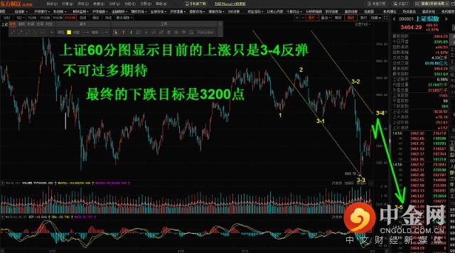 上证60分图显示目前的上涨只是3-4反弹,不可过多期待。最终的下跌目标是3200点。