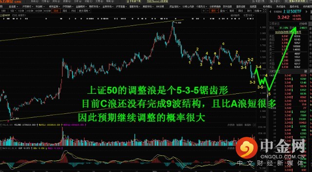 上证50的调整浪是个5-3-5锯齿形,目前C浪还没有完成9波结构,且比A浪短很多,因此预期继续调整的概率很大。