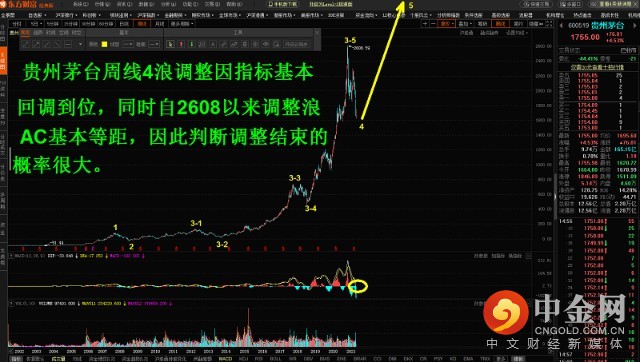 贵州茅台周线4浪调整因指标基本回调到位,同时自2608以来调整浪AC基本等距,因此判断调整结束的概率很大。