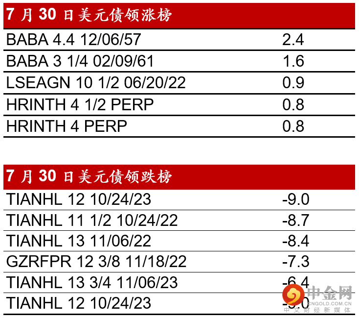 上周五(7月30日)中国高收益市场仍延续了整周低迷的情绪,早上恒大/佳兆业债券价格约下探2-5pts,但收市前部分私行客户捞底买入短端债券且做市商空头回补(short-cover),佳兆业债券价格约有些许回升,但较周四仍收跌约1-3pts,天基控股持续颓势下跌6-9pts。其他B评级债券也继续遭到抛售,富力/花样年/荣盛跌幅落在1-7pts;佳源国际宣布现金要约购买2022年及2023年到期债券,新力控股亦宣布已回购部分2021年及2022年到期债券,两家发行人债券价格表现都相对稳定。