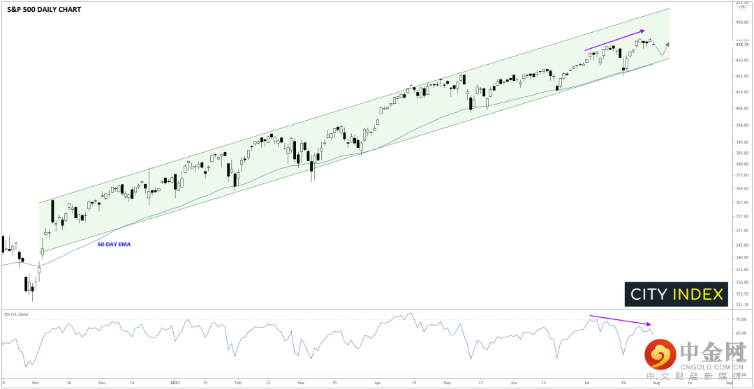 最受关注的美国股指之一标普500指数上周收盘价距离历史高点只有咫尺之遥。如下图所示,标普500指数始终得到其50天指数移动均线的支持,表明趋势强劲而健康。但RSI却呈现看跌背离,在价格过去三次到达顶峰时都形成下降的高点。这表明买盘压力减弱,近期触顶几率上升。如果本周的财报表现疲弱或备受瞩目的美国基建议案遇挫,RSI背离所构成的暗示意味可能更加浓厚。