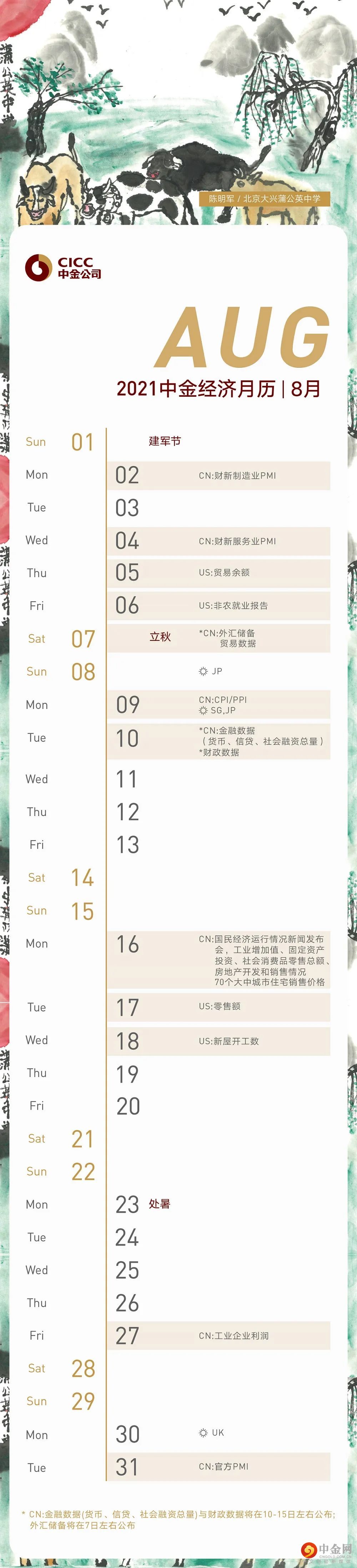 中金经济数据月历 | 2021年08月