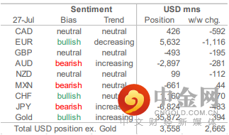 在截至 7 月 27 日的报告周中,投机交易者通过上周 CFTC 每周数据报告期货头寸,朝着建立看涨美元头寸的尝试性步骤发展得更为强劲。反映主要货币总头寸的美元净多头总额增加 26 亿美元至 35.6 亿美元。这是自去年 3 月初以来最大的美元多头头寸总额,表明头寸和情绪正在发生有利于美元的广泛转变。